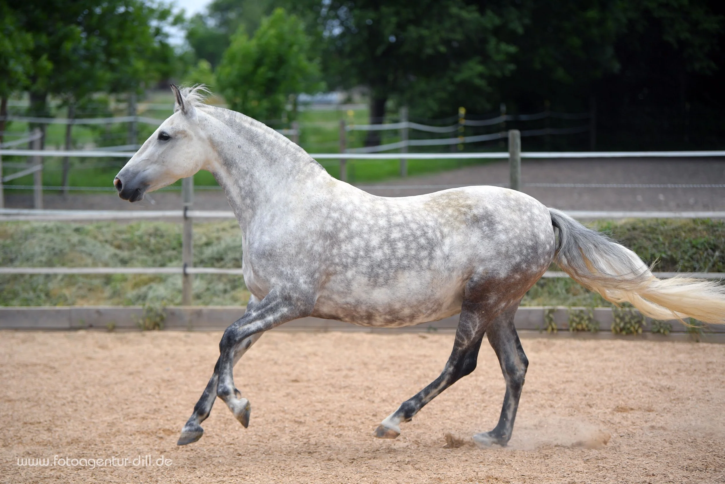 Su padre FUEGO DE CARDENAS le legó la capacidad para la reunión y el equilibrio, de su madre OPERA XXIV ha heredado la elegancia y su chic. Alegra se ha convertido en una joven y hermosa yegua y sobrepasa todas nuestras expectativas.